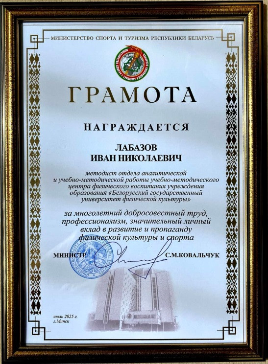 ЛАБАЗОВУ Ивану Николаевичу, методисту высшей квалификационной категории учебно-методического центра физического воспитания БГУФК, ветерану спортивной отрасли, воину-интернационалисту, в торжественной обстановке вручена Грамота Министерства спорта и туризма Республики Беларусь.